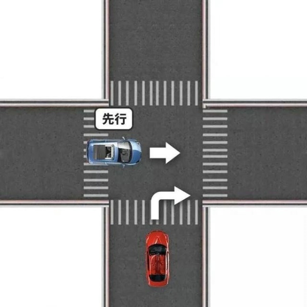 ![]() 图中红车准备右转,蓝车正在直行,此时转弯的红车须让直行蓝车先行。