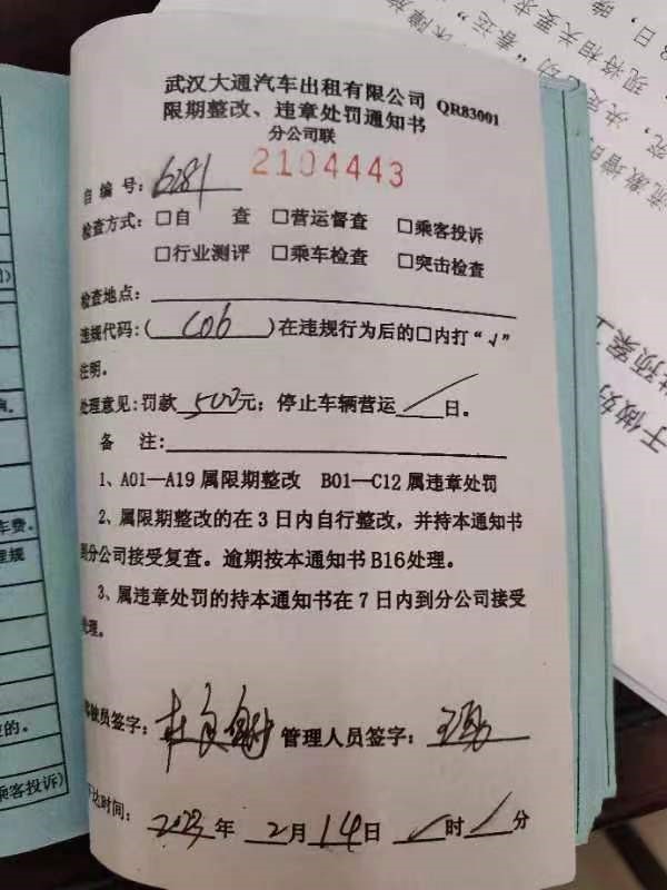 ![]() 对于该反映出租车拒载乘客问题我们非常重视,工作人员电话联系您了解情况,后通知当事驾驶员到公司接受调查,2月13日上午驾驶员回到公司接受调查。 经调查核实,您反映2月12日23:00在光谷广场拦停车牌号为DV9730出租车,经核实该车营运视频发现司机拒载成立,当事司机的行为违反了行业服务规范和公司规章制度。处理决定如下:1:对司机进行学习,提出批评,提高认识。2:记入诚信档案一次。3:营运罚款500元,2023年2月13日15:56我单位工作人员通过电话15717142972向您反馈办理情况,您已知晓办理结果。同时感谢您对我们工作的支持,祝您生活愉快!【经办单位:武汉大通汽车出租有限公司】。