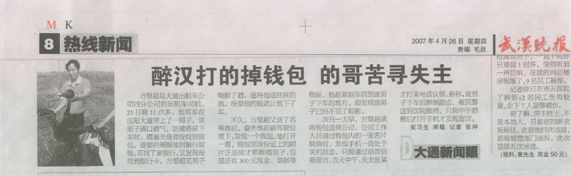 醉汉打的掉钱包 的哥苦寻失主(4082号车方望超)