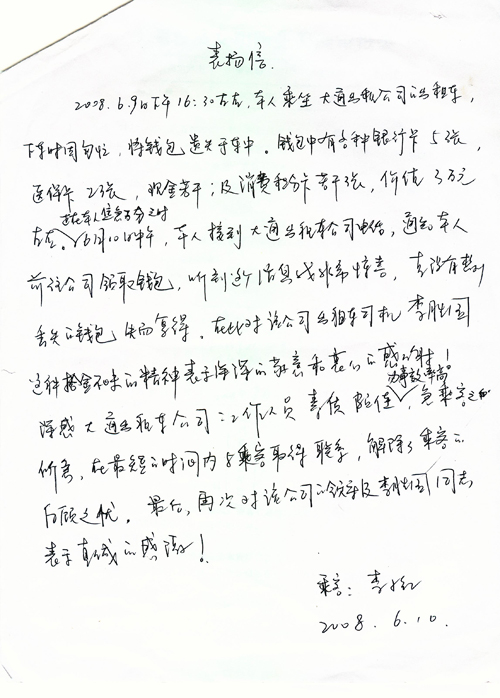 2008年6月9日下午16:30左右,本人乘坐大通出租公司的出租车,下车时因匆忙,将钱包遗失于车中。钱包中有各种银行卡5张、医保卡2张、现金若干及消费积分卡若干张,价值3万元左右。正在本人焦急万分之时,6月10日中午,本人接到大通出租车公司电话,通知本人前往公司领取钱包。听到这个消息我非常惊喜,真没有想到丢失的钱包失而复得。在此对该公司出租车司机李胜国这种拾金不昧的精神表示深深的敬意和衷心的感谢!深感大通出租车公司工作人员素质颇佳,办事效率高,急乘客之所急,在最短的时间内与乘客取得联系,解除了乘客的后顾之忧。最后,再次对改公司领导及李胜国同志表示真诚的感谢! 乘客:李小红 |