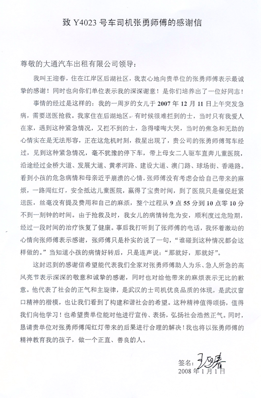 尊敬的大通汽车出租有限公司领导: 我叫王迎春,住在江岸区后湖社区,我衷心地向贵单位的张勇师傅表示最诚挚的感谢!同时也向你们单位表示我的深深谢意!是你们培养出了一位好同志! 事情的经过是这样的:我的一周岁的女儿于2007年12月11日上午突发急病,需要送医抢救。我家住在后湖地区,有时候很难拦到的士,当时只有我爱人在家,遇到这种紧急情况,又拦不到的士,急得嚎啕大哭,当时的焦急和无助的心情实在是无法形容,正在这危机时刻,救星出现了,贵公司的张勇师傅驾车经过,见到这种紧急情况,毫不犹豫的停下车,带上母女二人驱车直奔儿童医院,沿途经过金桥大道、发展大道、黄孝河路、建设大道、澳门路、球场街、香港路。看到小孩的危急病情和母亲近乎崩溃的心情,张师傅没有考虑会给自己带来的麻烦,一路闯红灯,安全抵达儿童医院,赢得了宝贵时间,到了医院只是催促赶紧送医,丝毫没有提及费用和自己的麻烦,整个过程从9点55分到10点零10分不到一刻钟的时间。由于抢救及时,我女儿的病情转危为安,顺利度过危险期,经过一段时间的治疗恢复了健康。事后我打听到了张师傅的电话,我怀着激动的心情向张师傅表示感谢,张师傅只是朴实的说了一句,“谁碰到这种情况都会这样做的。”当知道小孩的病情好转后,只是连声说:“那就好,那就好”。 这封迟到的感谢信希望能代表我们全家对张勇师傅助人为乐、急人所急的高风亮节表示深深的敬意和诚挚的感谢,同时也对给他带来的麻烦表示无比的歉意。他代表了社会的正气和主旋律,是武汉的士司机优良品质的体现,是武汉窗口精神的楷模,也让我们看到了构建和谐社会的希望。这种精神值得颂扬,值得我们向他学习!也希望贵单位能对他进行宣传、表扬,弘扬社会浩然正气。同时,恳请贵单位对张勇师傅闯红灯带来的后果进行合理的解决!我也将以张勇师傅的精神教育我的孩子,做一个正直、善良的人。