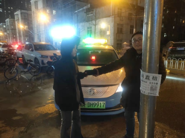 2022年2月17日,冷空气杀回马枪,晚上8点20分左右,天还空飘洒着雨夹雪,低温接近零度,寒意阵阵。大通四分公司4001号车驾驶员顾立定,营运到洪山光谷广场附近时,看到路边有两位年轻人在寒风中招手拦车,他赶紧把车开过去。