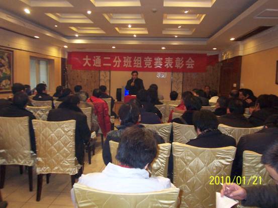 1月21日,大通二分公司召开了2009年班组竞赛年度表彰会,表彰2009年度中在班组建设中表现突出的优秀班组、先进班组长、先进个人、优秀通讯班组以及先进通讯员。总结推广他们在班组建设中的先进经验和做法,进一步激发各班组加强班组建设的积极性和创造性,努力把班组建设提高到一个新水平,为推动二分公司班组工作打下坚实的基础。会议由安全科长王小平主持,营运孙科长宣读竞赛内容及表彰决定,最后由熊经理总结发言并对大家做了殷切希望。